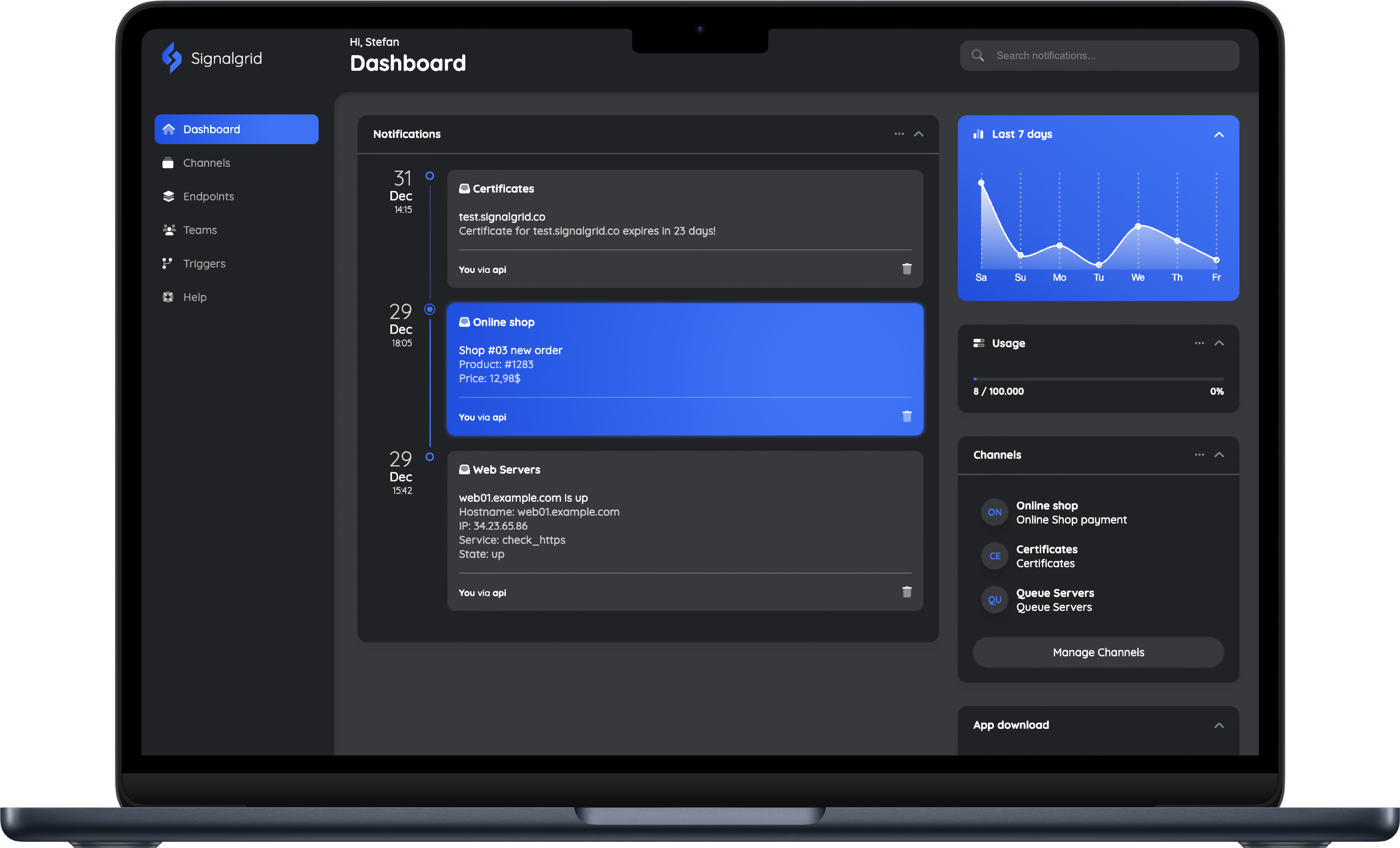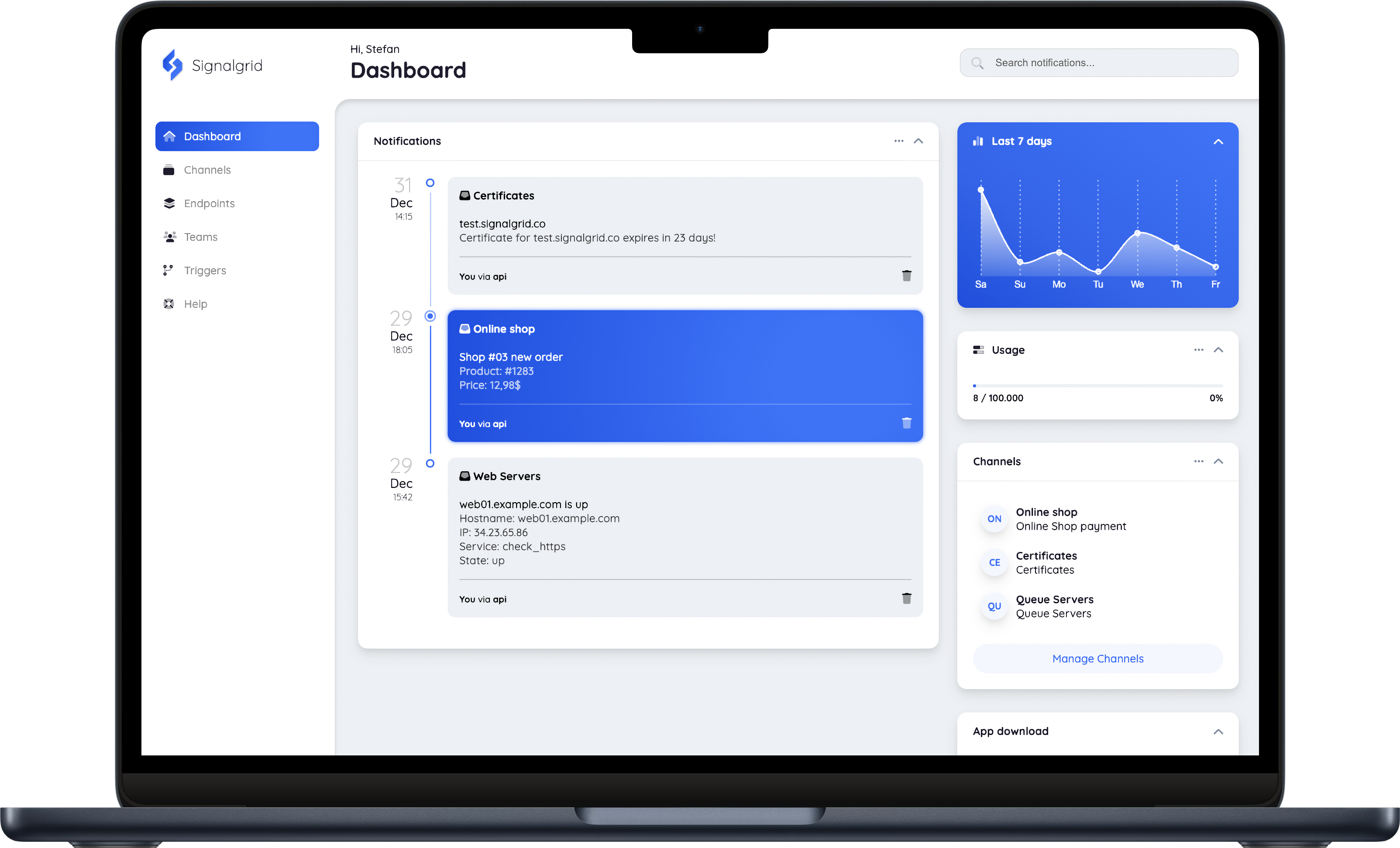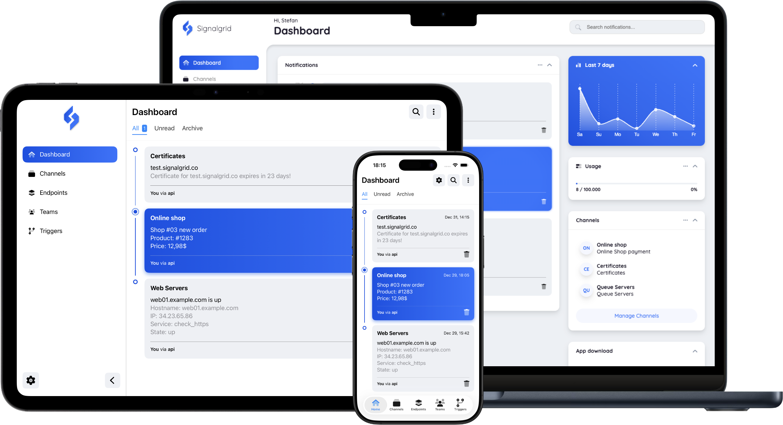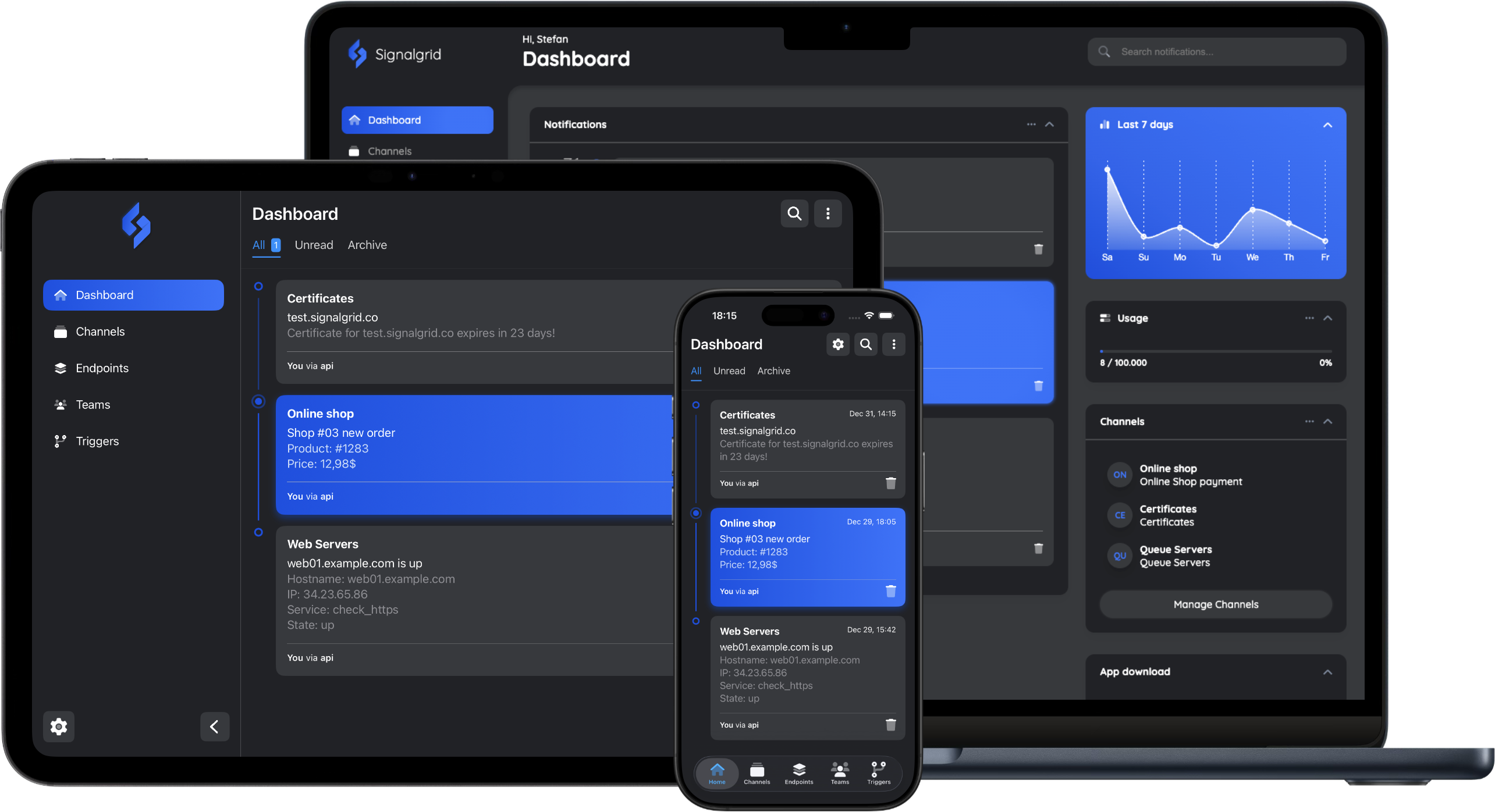 If you can send a POST request, you can use Signalgrid. No bulky SDKs or complex configurations. Just a simple, clean REST API that gets your alerts from your server to your screen instantly.